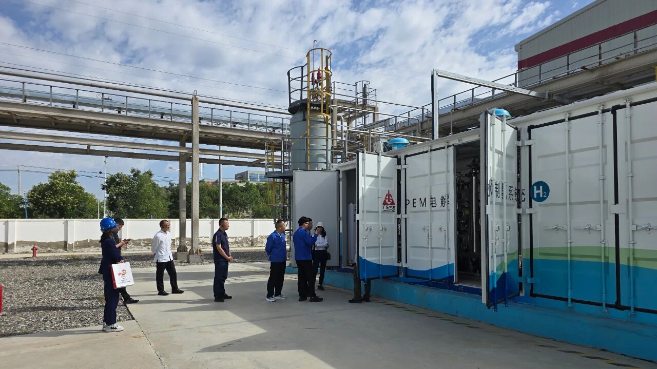 最后,考察团参观了甘肃省首个绿氢全链条示范工程——绿氢制储用加一体化试验示范项目。现场,碱性电解槽制氢车间、高压气态/液态储氢区、35MPa/70MPa双枪加氢站正有序运行。项目负责人李鹏飞介绍:“项目配套园区10MW光伏电站,实现了‘绿电制绿氢-园区重卡供能—余热回收’的闭环模式,其中液氢压缩机无油润滑技术填补了国内空白。”无锡天荣新能源科技有限公司CEO郭魏当场表达了合作意向:“我们计划在西北地区布局加氢站网络,希望与兰石在‘制氢装备定制化供应’和‘液氢储运技术联合研发’领域展开深度合作。”