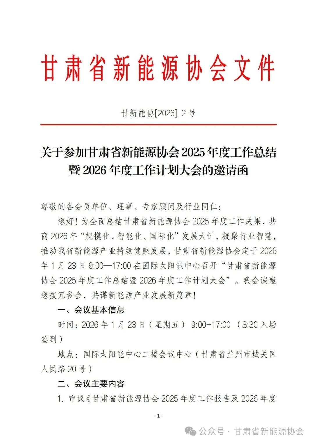 关于参加甘肃省新能源协会2025年度工作总结大会的邀请函